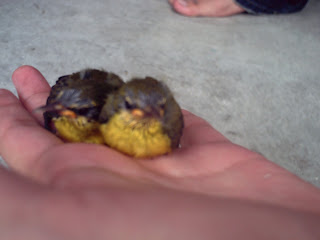 the baby birds are really very cute. so cuddly and so tame. they'll cling on to your fingers and let you pat them. *hehehe* i'll miss them when they fly away. but if they do not fly away, they'll die. oh well. at least the parents are still taking care of them now..but the way the parents force the kids to fly reminded me of the sermon on sunday, of how parents will not do anything to harm their kids. the parents did not mean to harm the kids when they destroyed the nest, they just wanted to the kids to learn to fly and do what they were created to do (soar in the skies). but the babies would not climb out of their nest to fly, so the parents have to destroy the nest to force them out. even now, when the babies refuse to fly, the parents still continue to care for them. one of them, the father (this black bibbed bird) is in charge of guarding and he is always somewhere near the nest, while the mother (the yellow one, no bib) will go and get food, as shown in the photos above (the one that shows her feeding). its an extra burden on them when the babies do not fly, but they still do it.